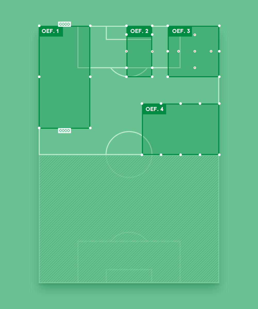 Noteer de afmetingen van de veldjes en maak groepen van minimaal 8 spelers. Na een centraal eindsignaal, draaien alle groepen met de klok mee naar de volgende oefening.