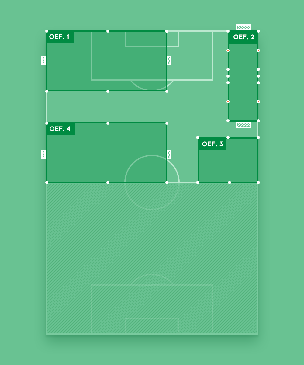 Noteer de afmetingen van de veldjes en maak groepen van minimaal 8 spelers. Na een centraal eindsignaal, draaien alle groepen met de klok mee naar de volgende oefening.
