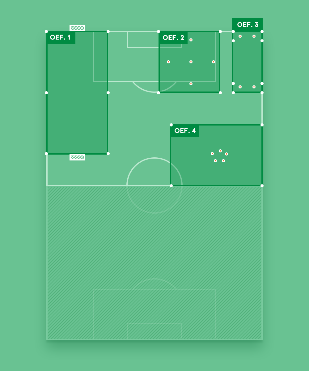 Noteer de afmetingen van de veldjes en maak groepen van minimaal 8 spelers. Na een centraal eindsignaal, draaien alle groepen met de klok mee naar de volgende oefening.