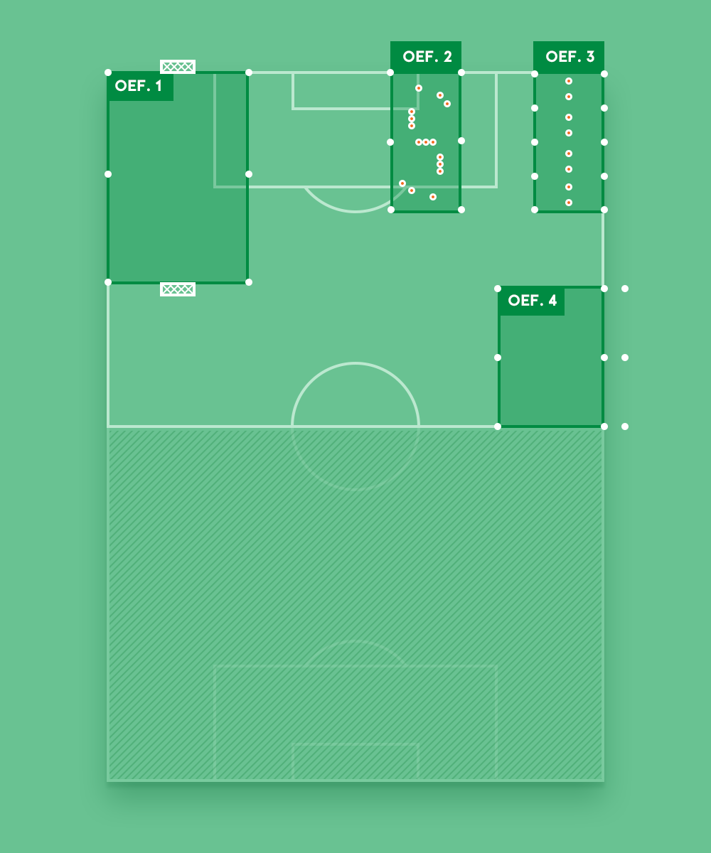 Noteer de afmetingen van de veldjes en maak groepen van minimaal 8 spelers. Na een centraal eindsignaal, draaien alle groepen met de klok mee naar de volgende oefening.