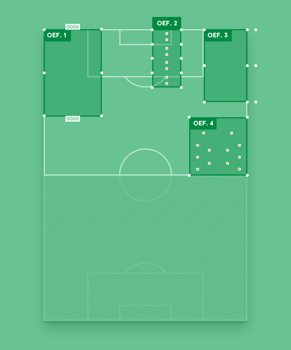 Noteer de afmetingen van de veldjes en maak groepen van minimaal 8 spelers. Na een centraal eindsignaal, draaien alle groepen met de klok mee naar de volgende oefening.