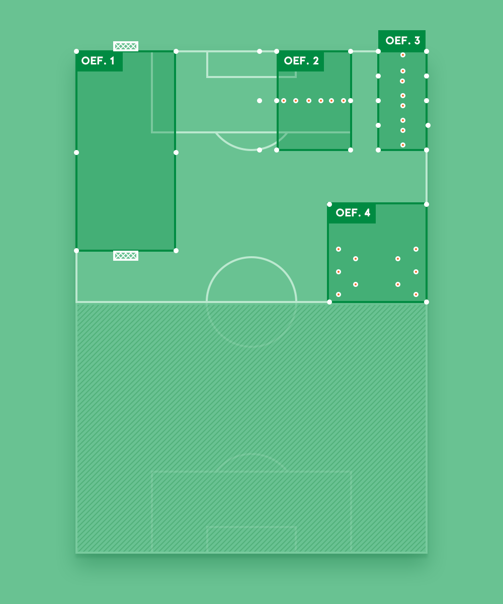 Noteer de afmetingen van de veldjes en maak groepen van minimaal 8 spelers. Na een centraal eindsignaal, draaien alle groepen met de klok mee naar de volgende oefening.