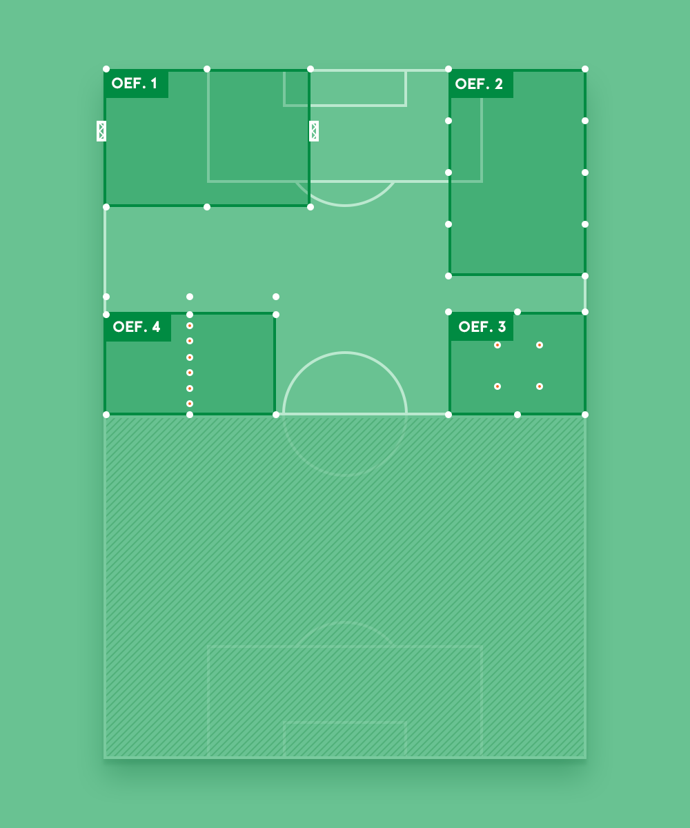 Noteer de afmetingen van de veldjes en maak groepen van minimaal 8 spelers. Na een centraal eindsignaal, draaien alle groepen met de klok mee naar de volgende oefening.
