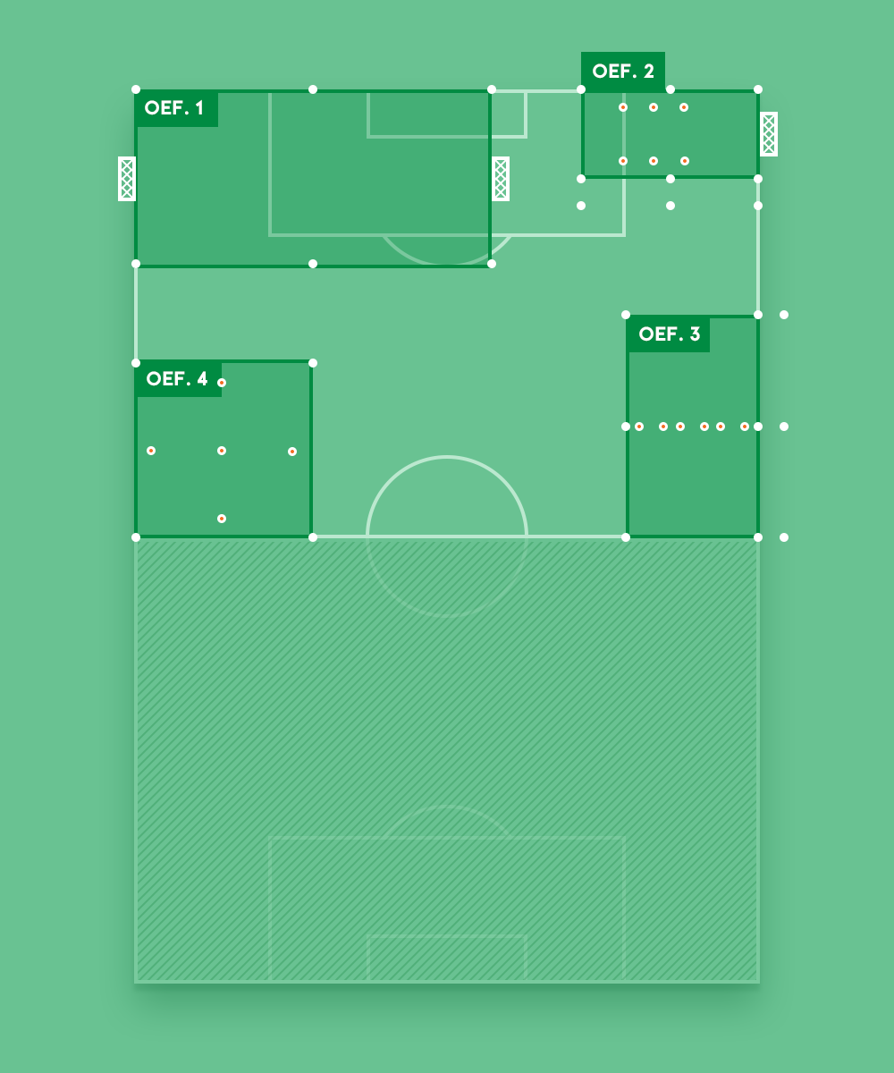 Noteer de afmetingen van de veldjes en maak groepen van minimaal 8 spelers. Na een centraal eindsignaal, draaien alle groepen met de klok mee naar de volgende oefening.