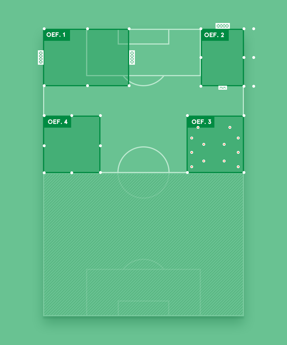 Noteer de afmetingen van de veldjes en maak groepen van minimaal 8 spelers. Na een centraal eindsignaal, draaien alle groepen met de klok mee naar de volgende oefening.