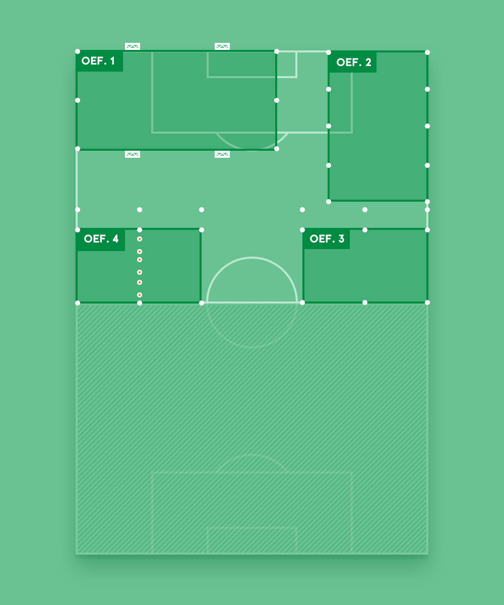 Noteer de afmetingen van de veldjes en maak groepen van minimaal 8 spelers. Na een centraal eindsignaal, draaien alle groepen met de klok mee naar de volgende oefening.