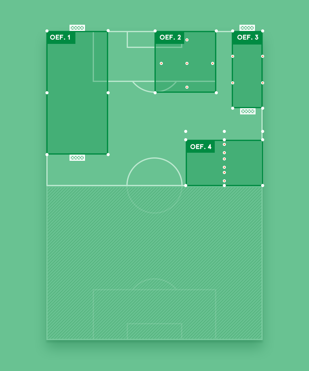 Noteer de afmetingen van de veldjes en maak groepen van minimaal 8 spelers. Na een centraal eindsignaal, draaien alle groepen met de klok mee naar de volgende oefening.