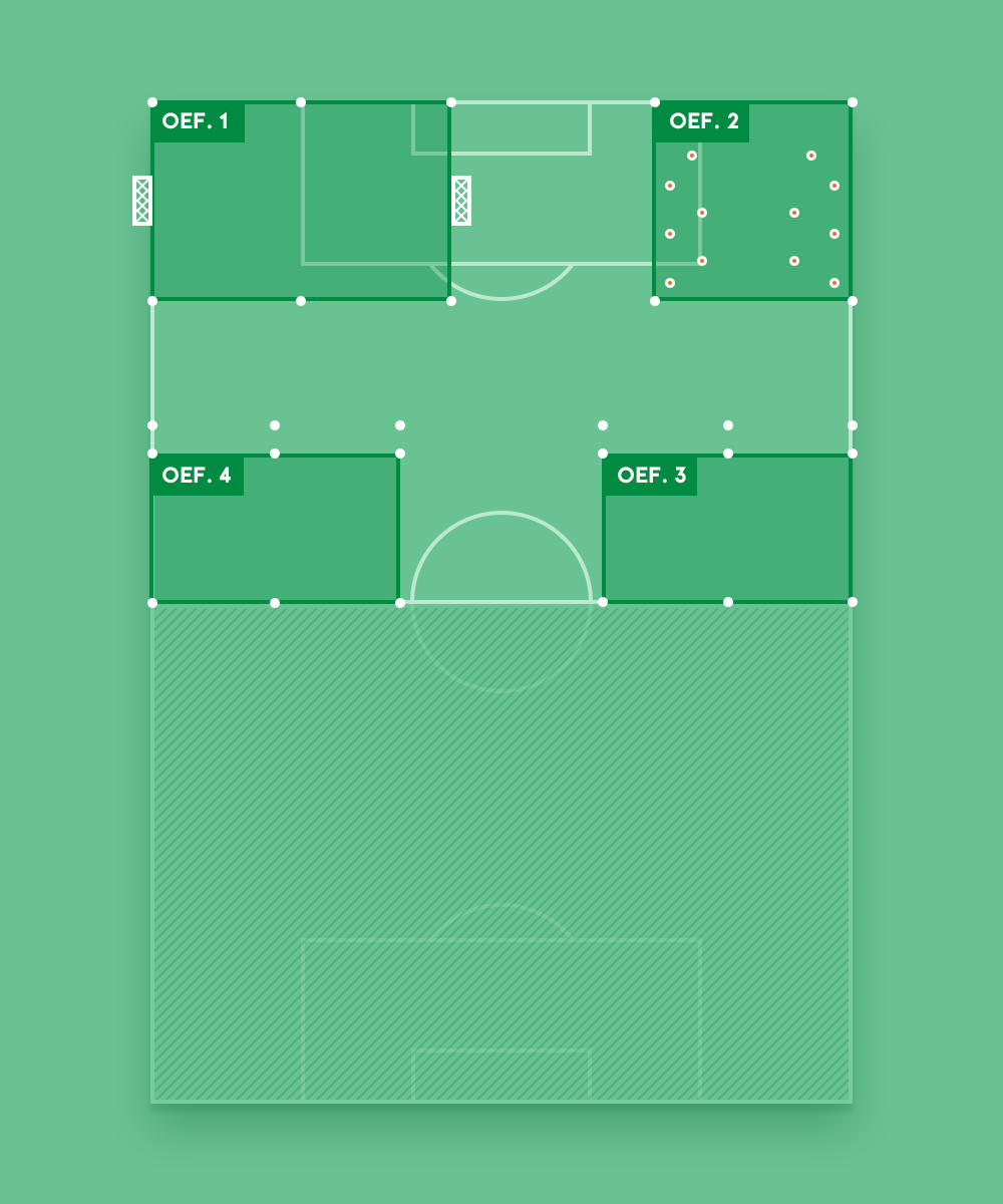Noteer de afmetingen van de veldjes en maak groepen van minimaal 8 spelers. Na een centraal eindsignaal, draaien alle groepen met de klok mee naar de volgende oefening.