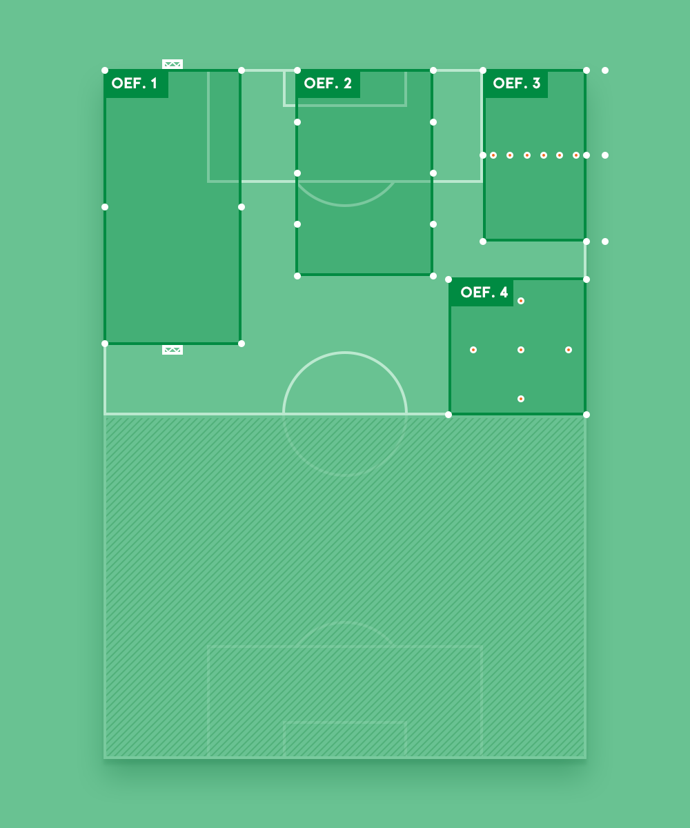Noteer de afmetingen van de veldjes en maak groepen van minimaal 8 spelers. Na een centraal eindsignaal, draaien alle groepen met de klok mee naar de volgende oefening.