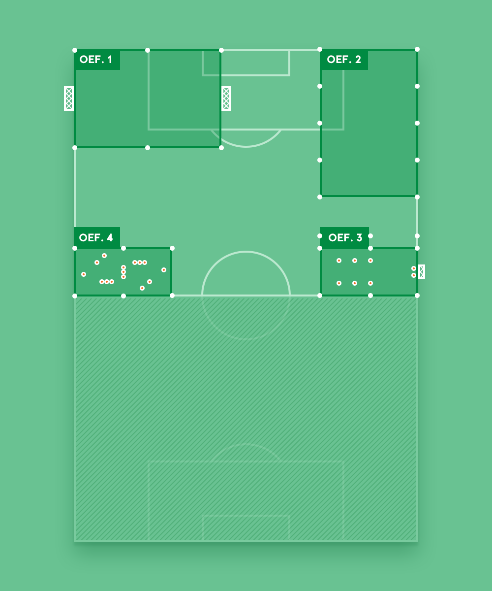 Noteer de afmetingen van de veldjes en maak groepen van minimaal 8 spelers. Na een centraal eindsignaal, draaien alle groepen met de klok mee naar de volgende oefening.