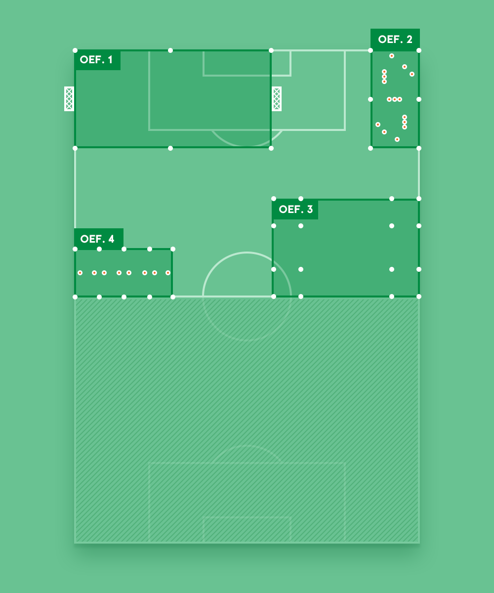 Noteer de afmetingen van de veldjes en maak groepen van minimaal 8 spelers. Na een centraal eindsignaal, draaien alle groepen met de klok mee naar de volgende oefening.