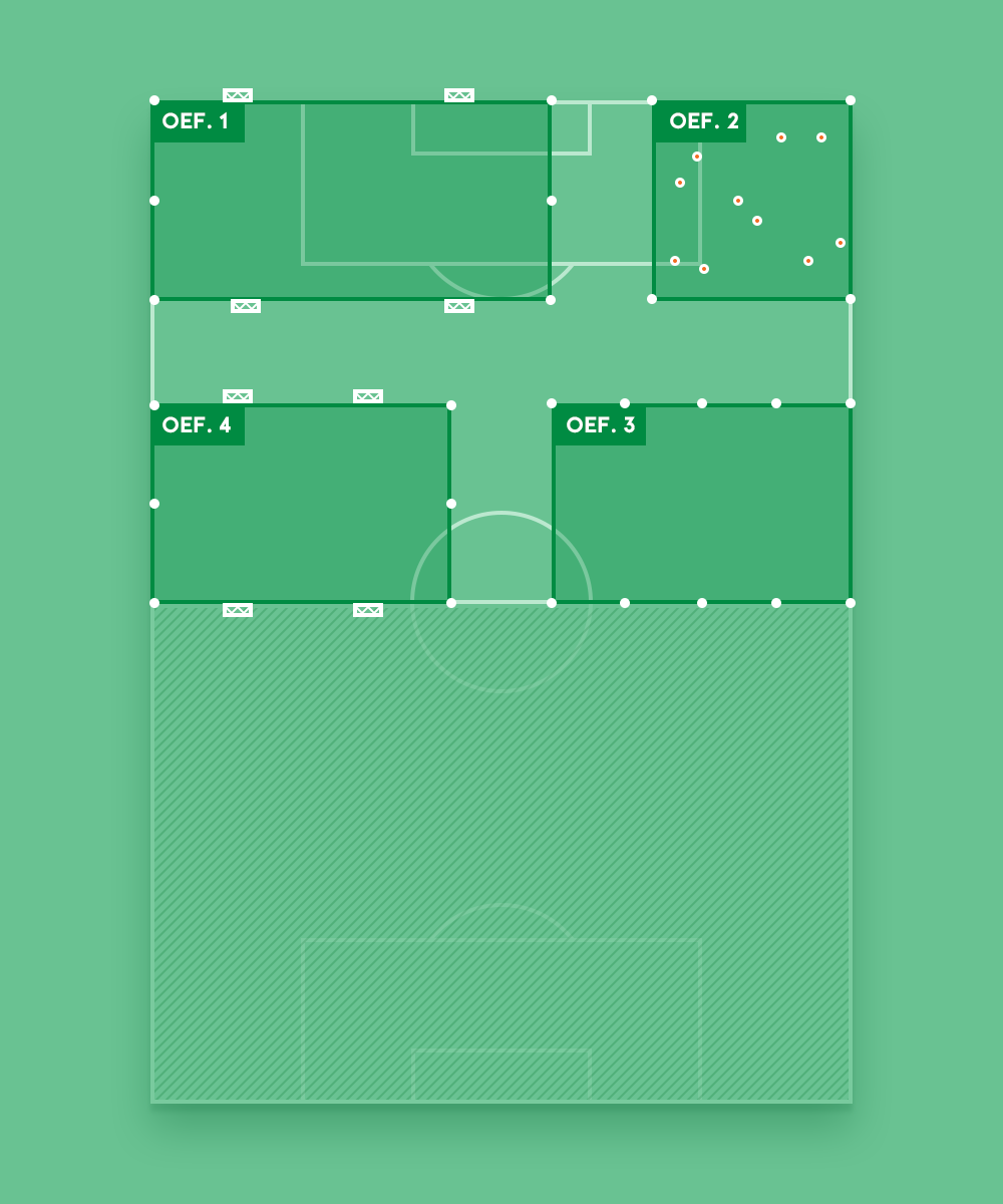 Noteer de afmetingen van de veldjes en maak groepen van minimaal 8 spelers. Na een centraal eindsignaal, draaien alle groepen met de klok mee naar de volgende oefening.