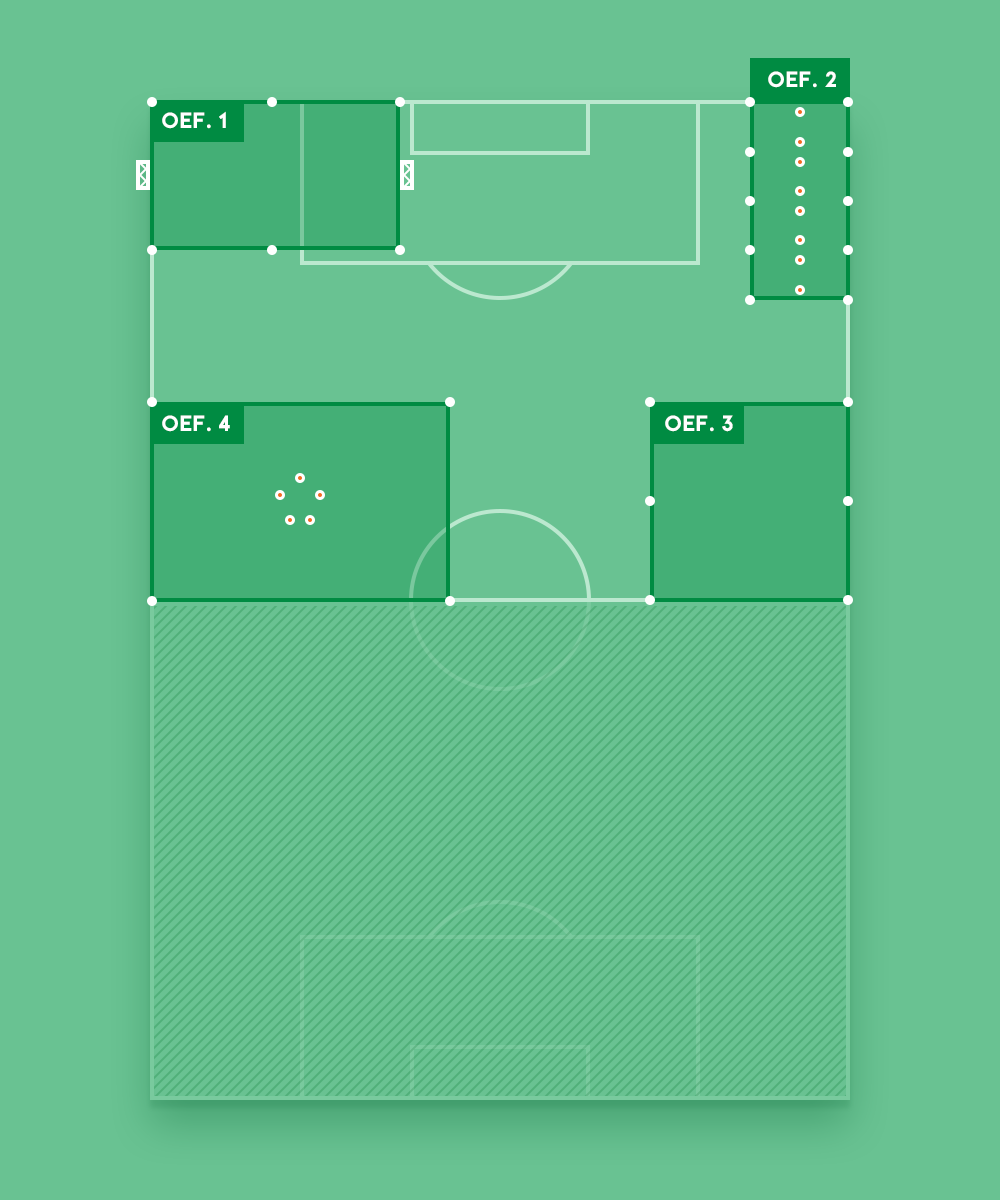 Noteer de afmetingen van de veldjes en maak groepen van minimaal 6 spelers. Na een centraal eindsignaal, draaien alle groepen met de klok mee naar de volgende oefening.
