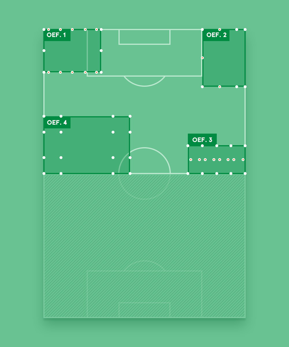 Noteer de afmetingen van de veldjes en maak groepen van minimaal 6 spelers. Na een centraal eindsignaal, draaien alle groepen met de klok mee naar de volgende oefening.