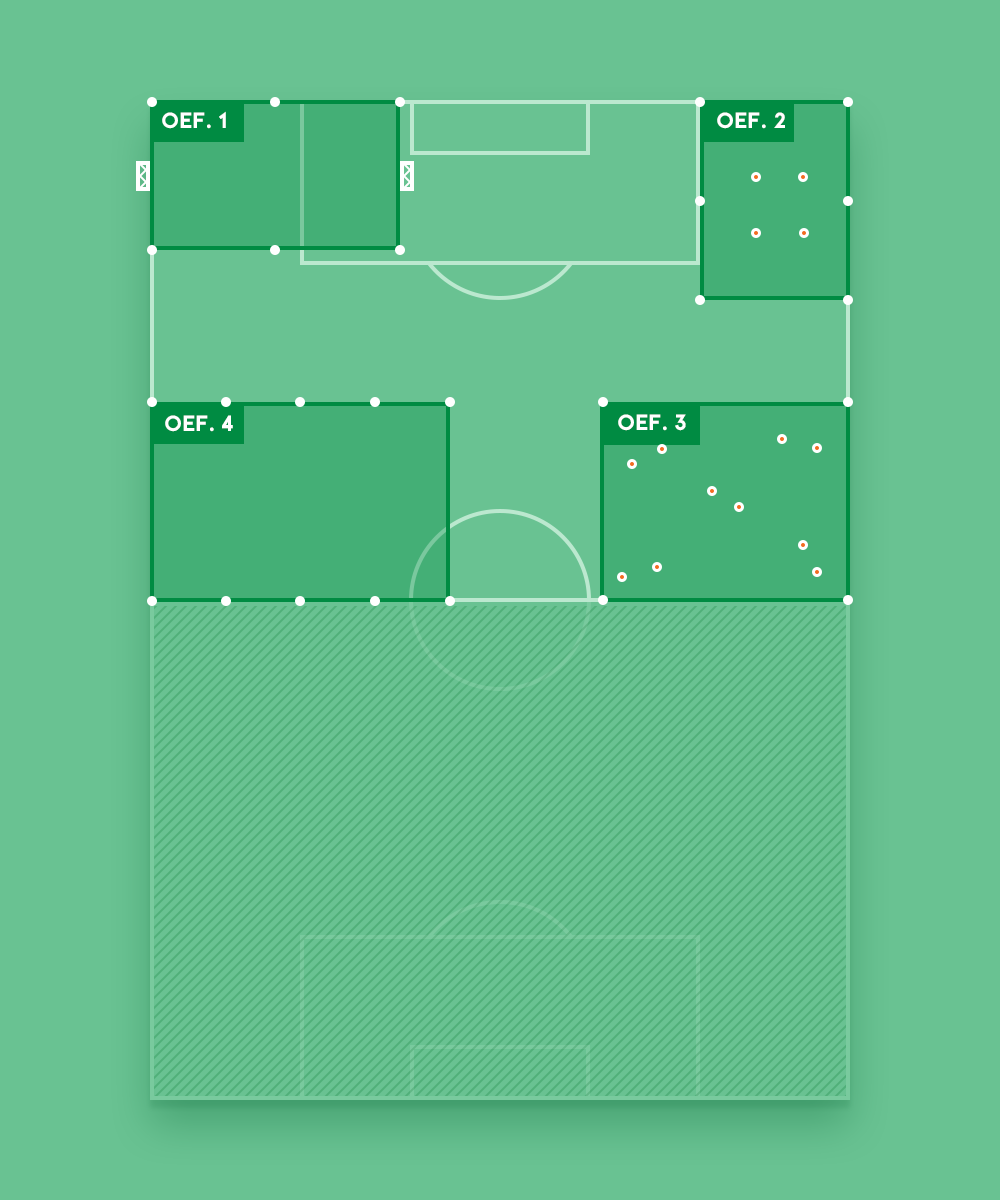 Noteer de afmetingen van de veldjes en maak groepen van minimaal 6 spelers. Na een centraal eindsignaal, draaien alle groepen met de klok mee naar de volgende oefening.