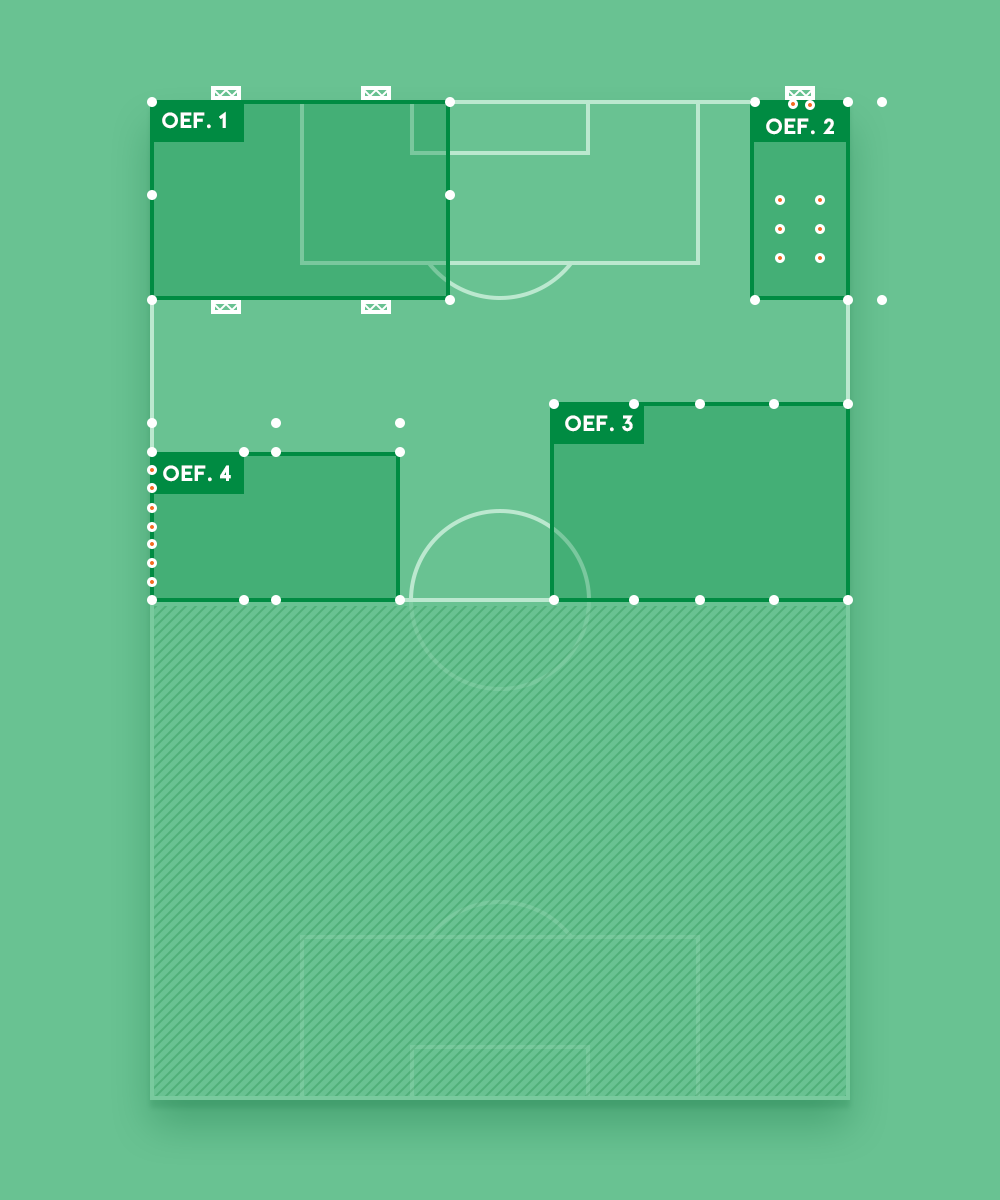 Noteer de afmetingen van de veldjes en maak groepen van minimaal 6 spelers. Na een centraal eindsignaal, draaien alle groepen met de klok mee naar de volgende oefening.
