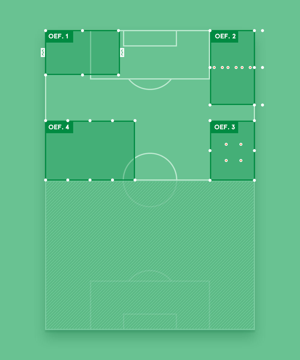 Noteer de afmetingen van de veldjes en maak groepen van minimaal 6 spelers. Na een centraal eindsignaal, draaien alle groepen met de klok mee naar de volgende oefening.