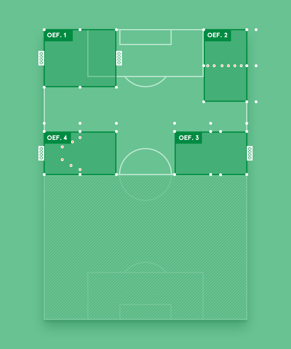 Noteer de afmetingen van de veldjes en maak groepen van minimaal 6 spelers. Na een centraal eindsignaal, draaien alle groepen met de klok mee naar de volgende oefening.