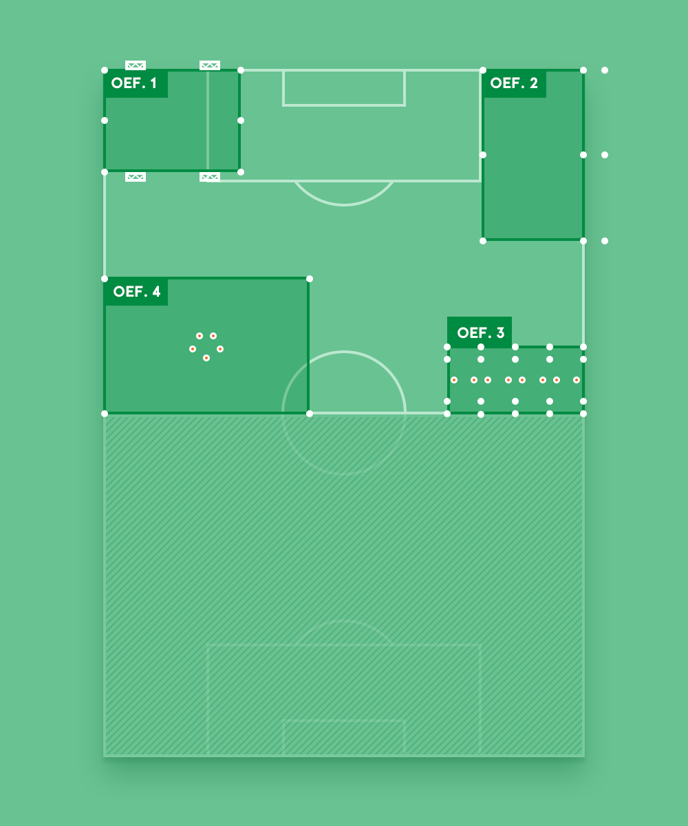 Noteer de afmetingen van de veldjes en maak groepen van minimaal 6 spelers. Na een centraal eindsignaal, draaien alle groepen met de klok mee naar de volgende oefening.