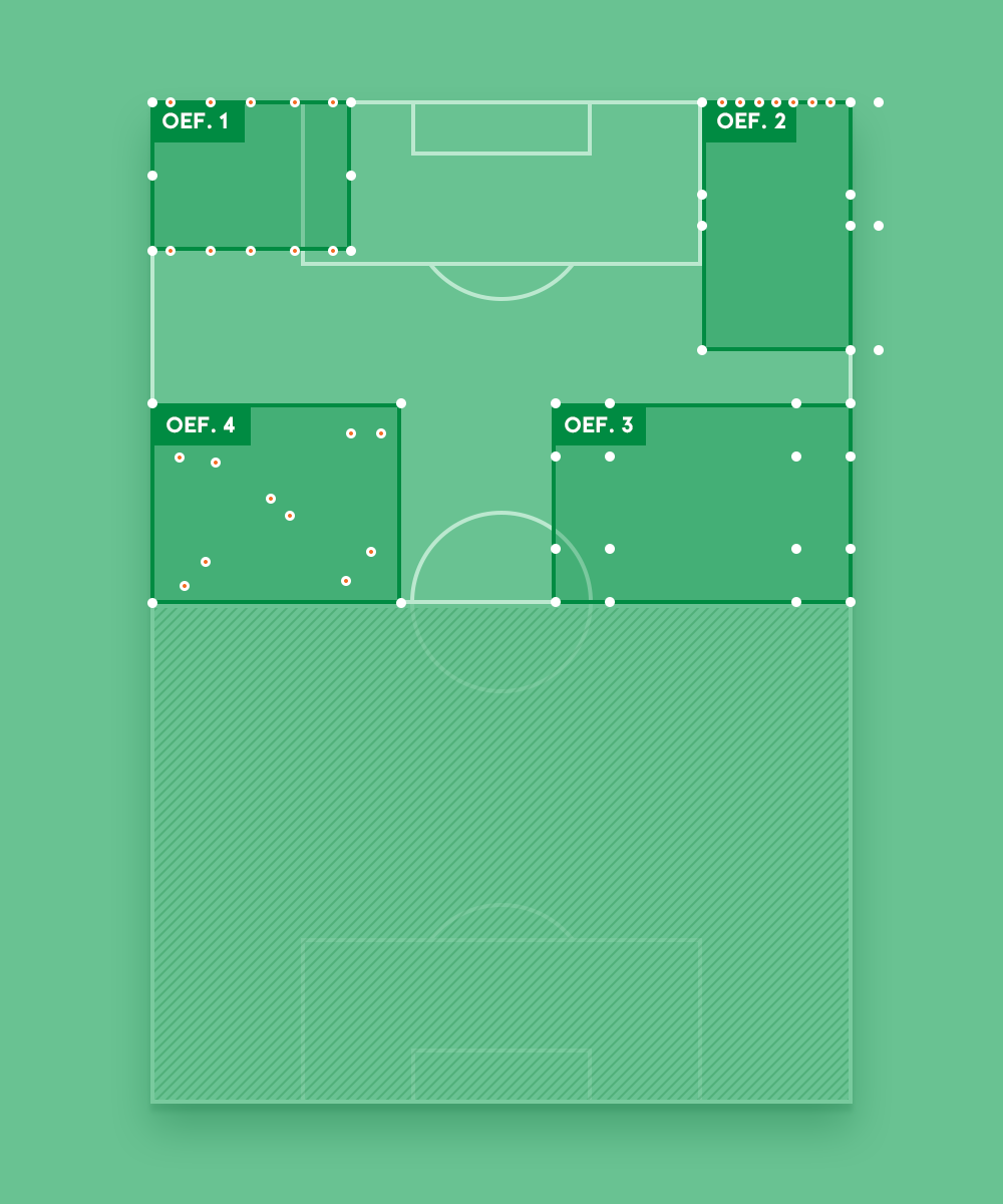 Noteer de afmetingen van de veldjes en maak groepen van minimaal 6 spelers. Na een centraal eindsignaal, draaien alle groepen met de klok mee naar de volgende oefening.