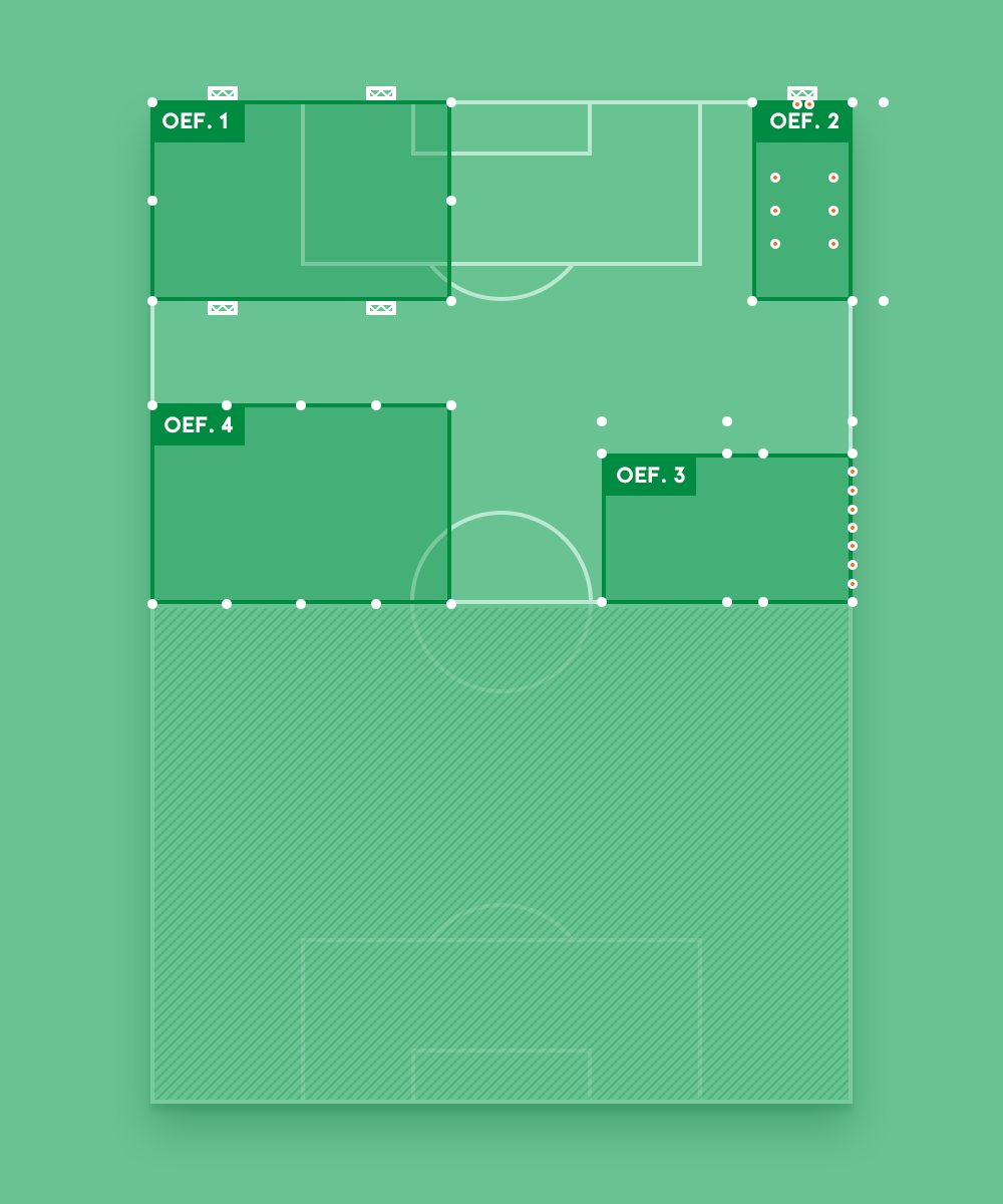 Noteer de afmetingen van de veldjes en maak groepen van minimaal 6 spelers. Na een centraal eindsignaal, draaien alle groepen met de klok mee naar de volgende oefening.