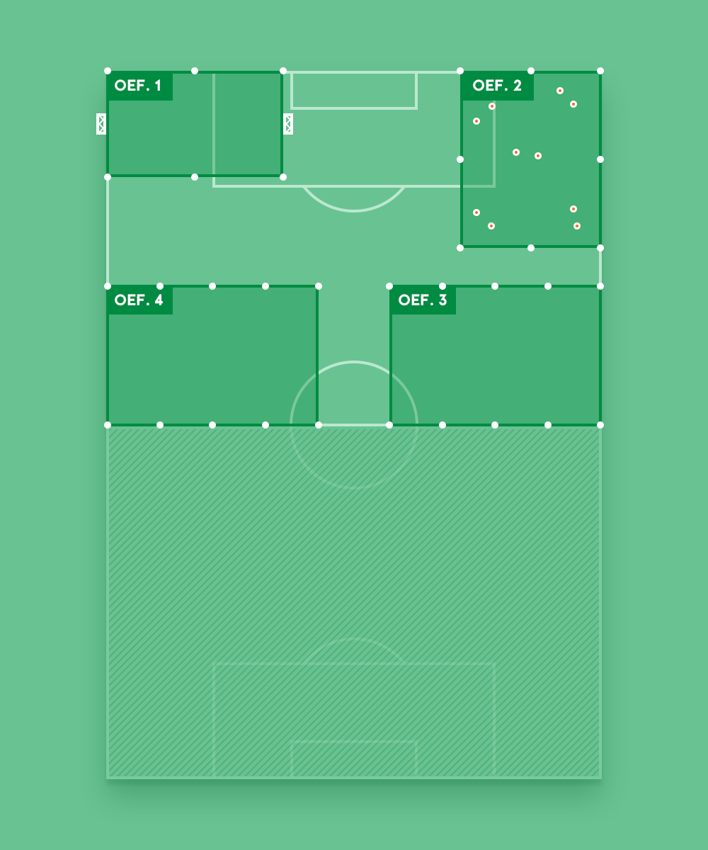 Noteer de afmetingen van de veldjes en maak groepen van minimaal 6 spelers. Na een centraal eindsignaal, draaien alle groepen met de klok mee naar de volgende oefening.