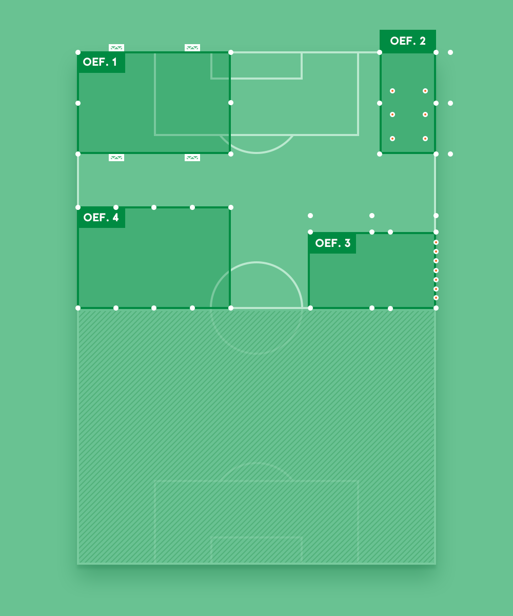 Noteer de afmetingen van de veldjes en maak groepen van minimaal 6 spelers. Na een centraal eindsignaal, draaien alle groepen met de klok mee naar de volgende oefening.