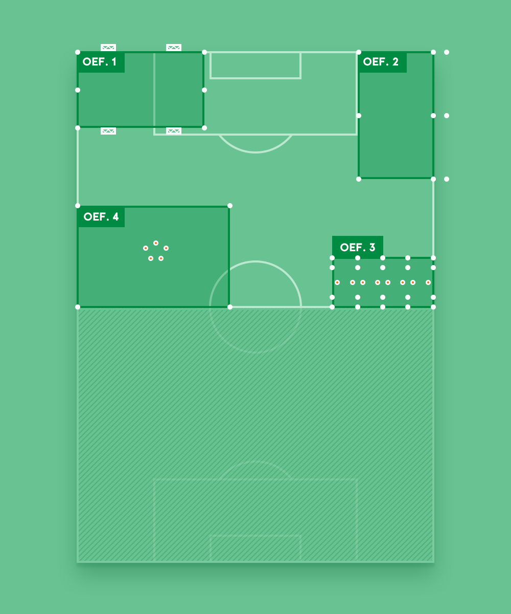 Noteer de afmetingen van de veldjes en maak groepen van minimaal 6 spelers. Na een centraal eindsignaal, draaien alle groepen met de klok mee naar de volgende oefening.