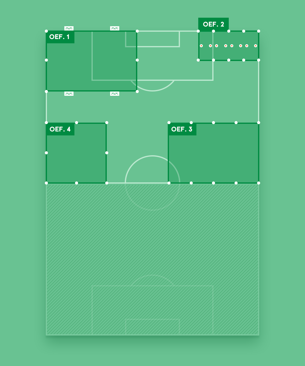 Noteer de afmetingen van de veldjes en maak groepen van minimaal 6 spelers. Na een centraal eindsignaal, draaien alle groepen met de klok mee naar de volgende oefening.