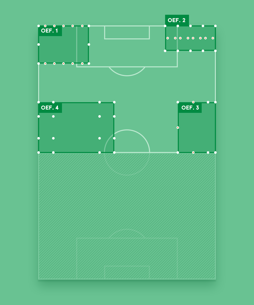 Noteer de afmetingen van de veldjes en maak groepen van minimaal 6 spelers. Na een centraal eindsignaal, draaien alle groepen met de klok mee naar de volgende oefening.