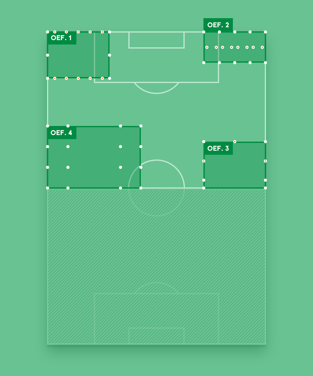 Noteer de afmetingen van de veldjes en maak groepen van minimaal 6 spelers. Na een centraal eindsignaal, draaien alle groepen met de klok mee naar de volgende oefening.