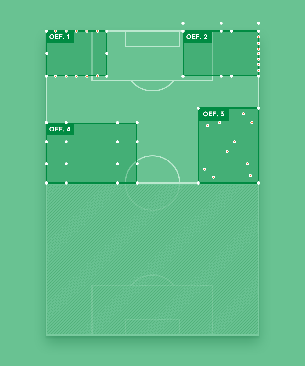 Noteer de afmetingen van de veldjes en maak groepen van minimaal 6 spelers. Na een centraal eindsignaal, draaien alle groepen met de klok mee naar de volgende oefening.
