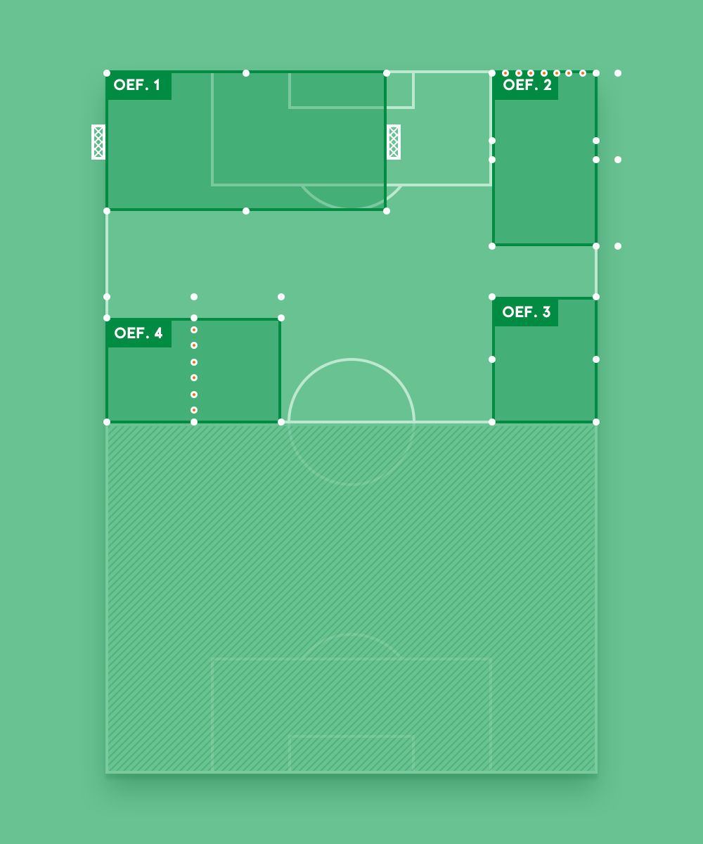 Noteer de afmetingen van de veldjes en maak groepen van minimaal 8 spelers. Na een centraal eindsignaal, draaien alle groepen met de klok mee naar de volgende oefening.