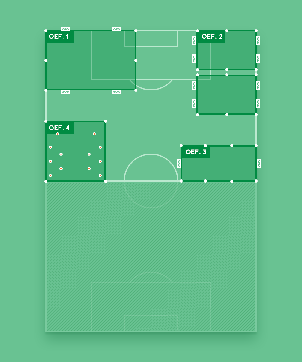 Noteer de afmetingen van de veldjes en maak groepen van minimaal 8 spelers. Na een centraal eindsignaal, draaien alle groepen met de klok mee naar de volgende oefening.
