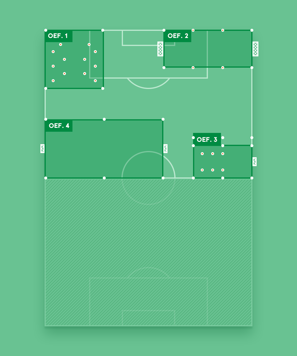 Noteer de afmetingen van de veldjes en maak groepen van minimaal 8 spelers. Na een centraal eindsignaal, draaien alle groepen met de klok mee naar de volgende oefening.