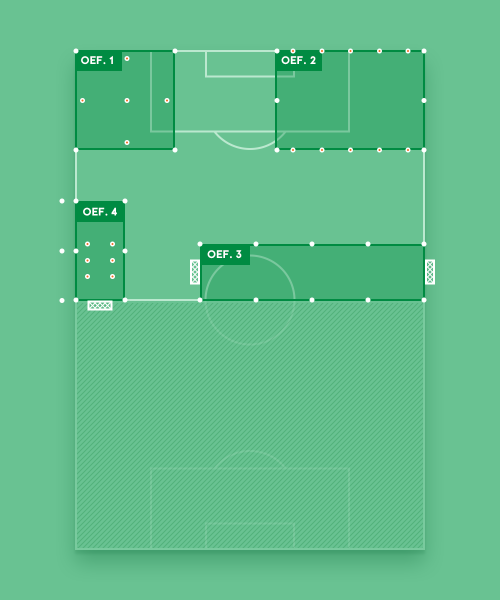 Noteer de afmetingen van de veldjes en maak groepen van minimaal 8 spelers. Na een centraal eindsignaal, draaien alle groepen met de klok mee naar de volgende oefening.