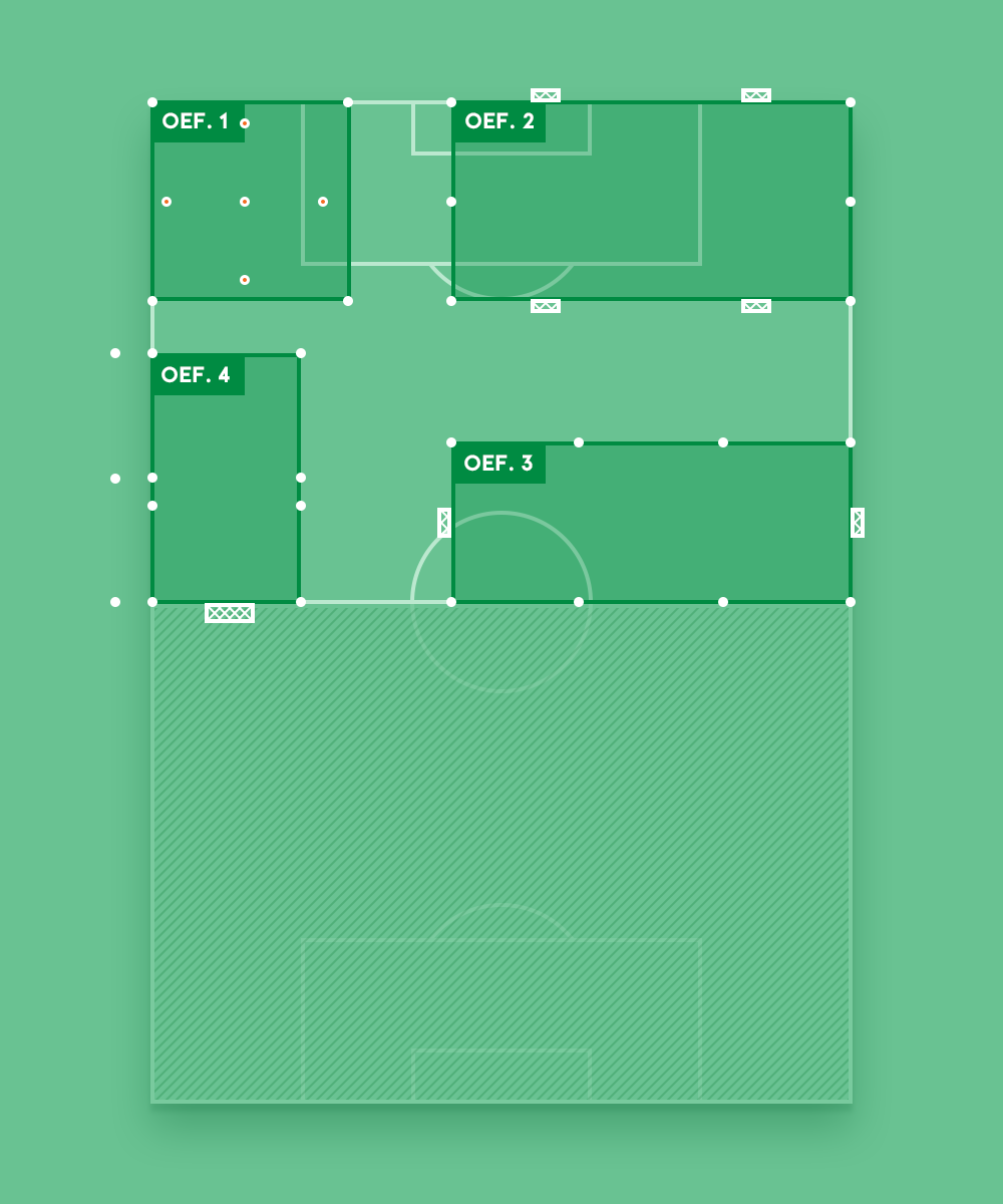 Noteer de afmetingen van de veldjes en maak groepen van minimaal 8 spelers. Na een centraal eindsignaal, draaien alle groepen met de klok mee naar de volgende oefening.