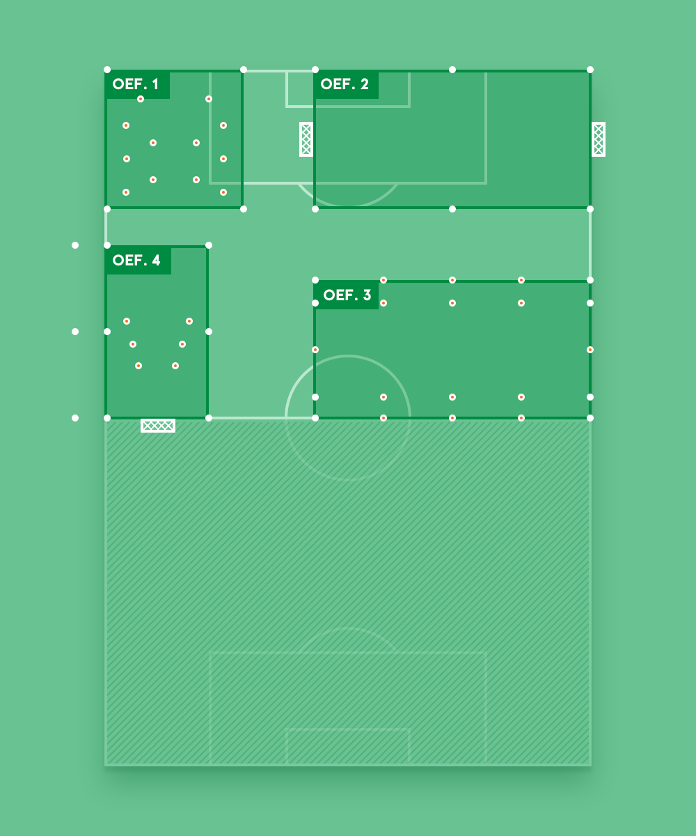 Noteer de afmetingen van de veldjes en maak groepen van minimaal 8 spelers. Na een centraal eindsignaal, draaien alle groepen met de klok mee naar de volgende oefening.