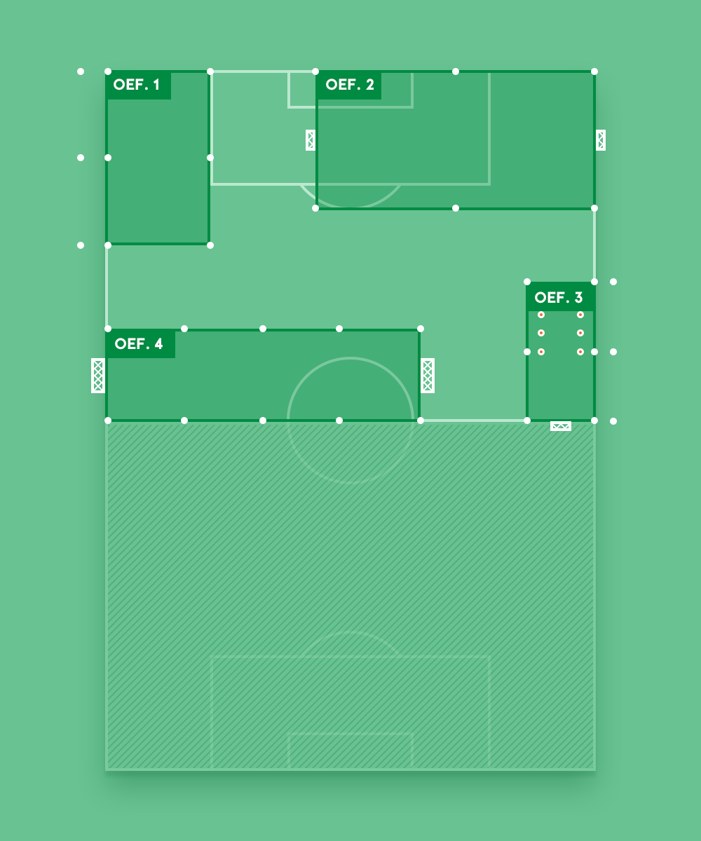 Noteer de afmetingen van de veldjes en maak groepen van minimaal 8 spelers. Na een centraal eindsignaal, draaien alle groepen met de klok mee naar de volgende oefening.