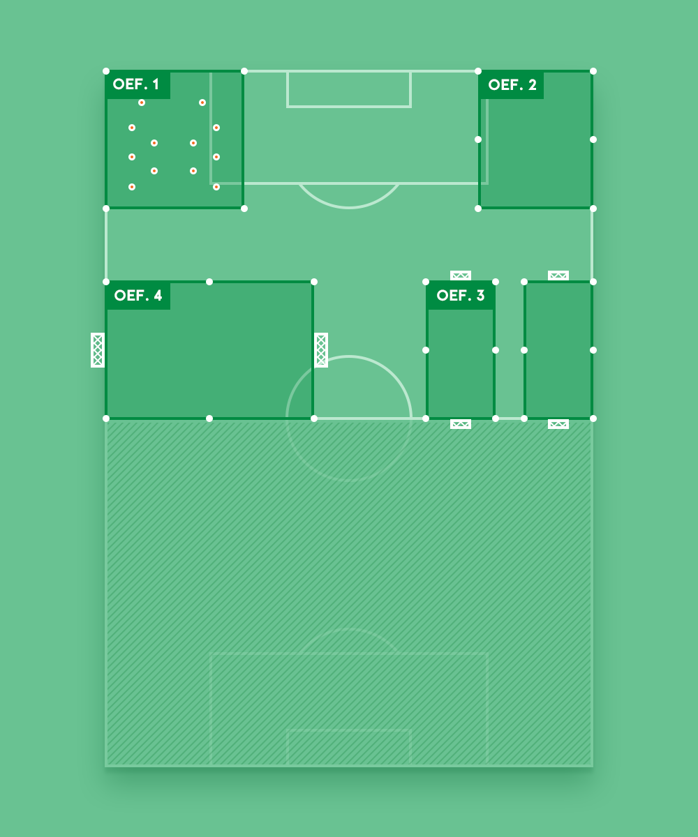 Noteer de afmetingen van de veldjes en maak groepen van minimaal 8 spelers. Na een centraal eindsignaal, draaien alle groepen met de klok mee naar de volgende oefening.