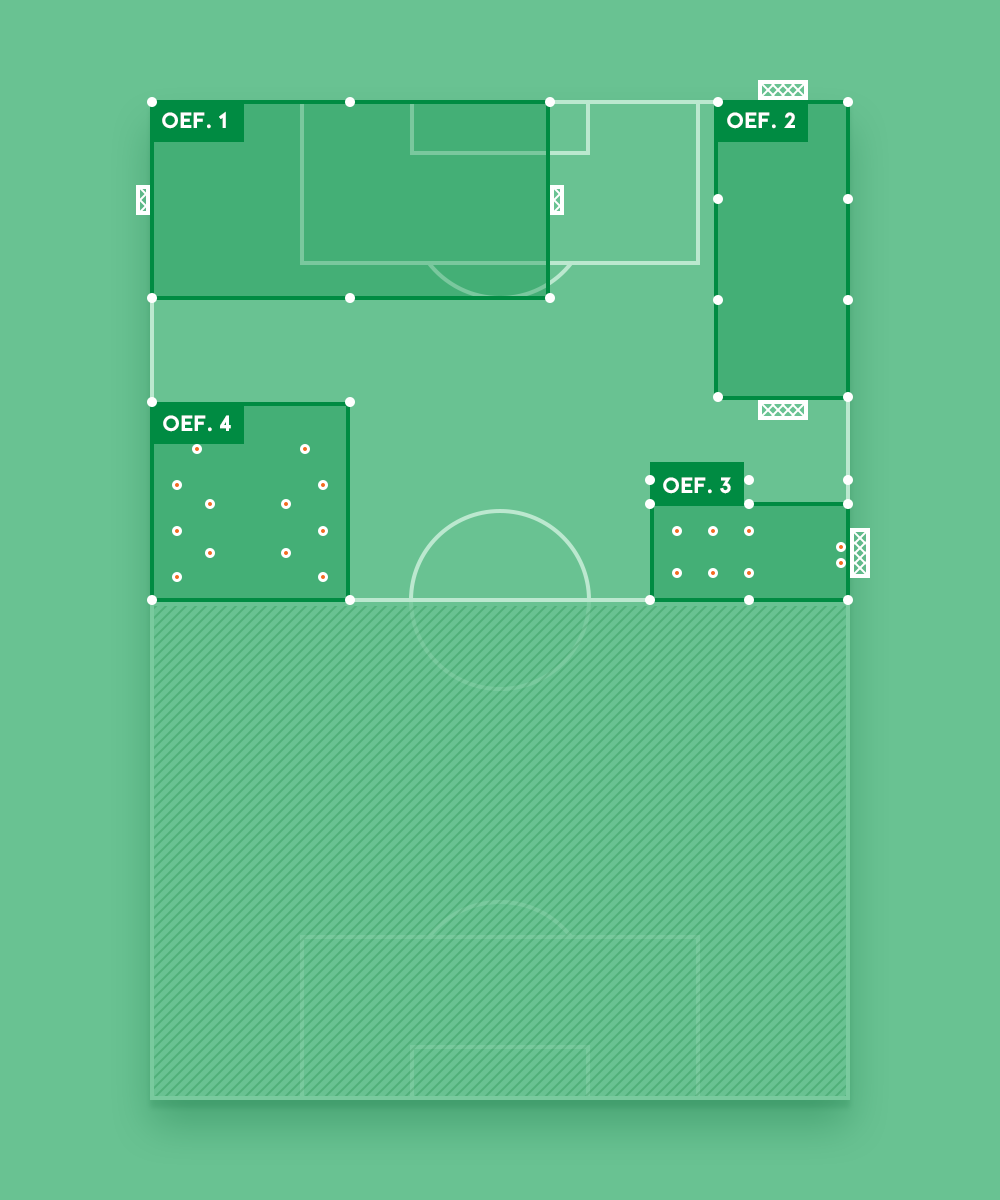 Noteer de afmetingen van de veldjes en maak groepen van minimaal 8 spelers. Na een centraal eindsignaal, draaien alle groepen met de klok mee naar de volgende oefening.