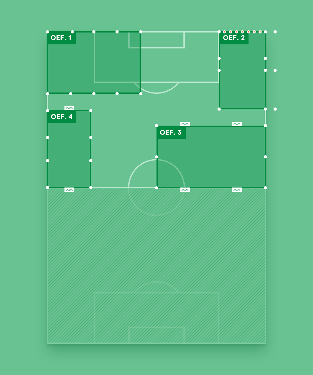 Noteer de afmetingen van de veldjes en maak groepen van minimaal 8 spelers. Na een centraal eindsignaal, draaien alle groepen met de klok mee naar de volgende oefening.