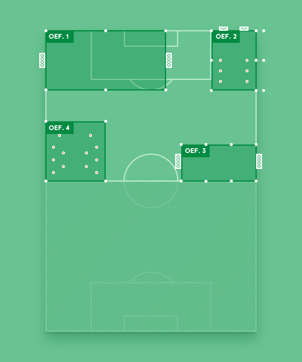 Noteer de afmetingen van de veldjes en maak groepen van minimaal 8 spelers. Na een centraal eindsignaal, draaien alle groepen met de klok mee naar de volgende oefening.