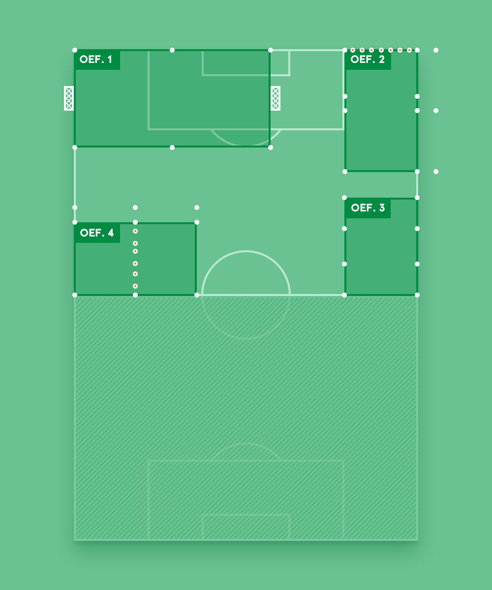 Noteer de afmetingen van de veldjes en maak groepen van minimaal 8 spelers. Na een centraal eindsignaal, draaien alle groepen met de klok mee naar de volgende oefening.