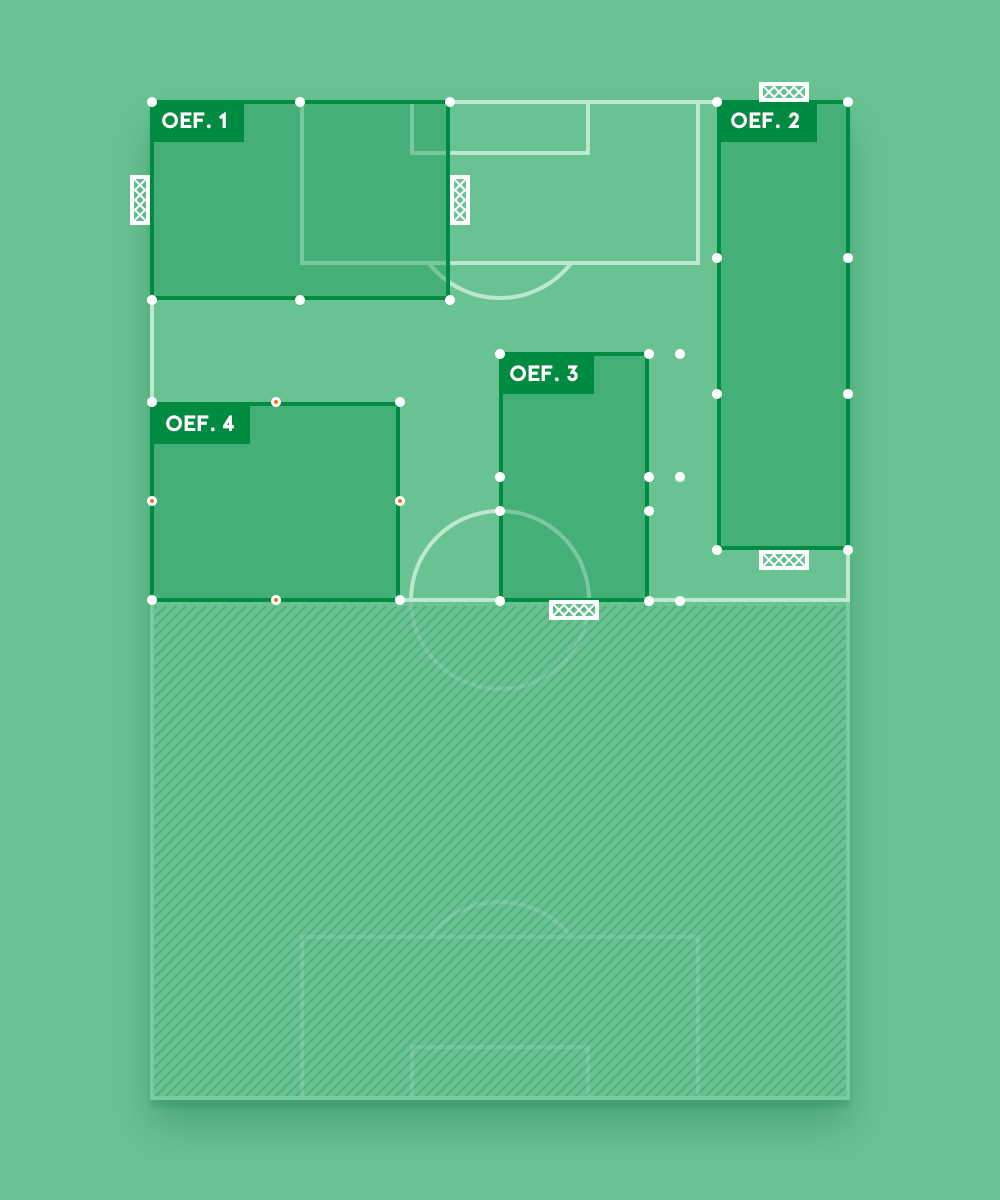 Noteer de afmetingen van de veldjes en maak groepen van minimaal 8 spelers. Na een centraal eindsignaal, draaien alle groepen met de klok mee naar de volgende oefening.