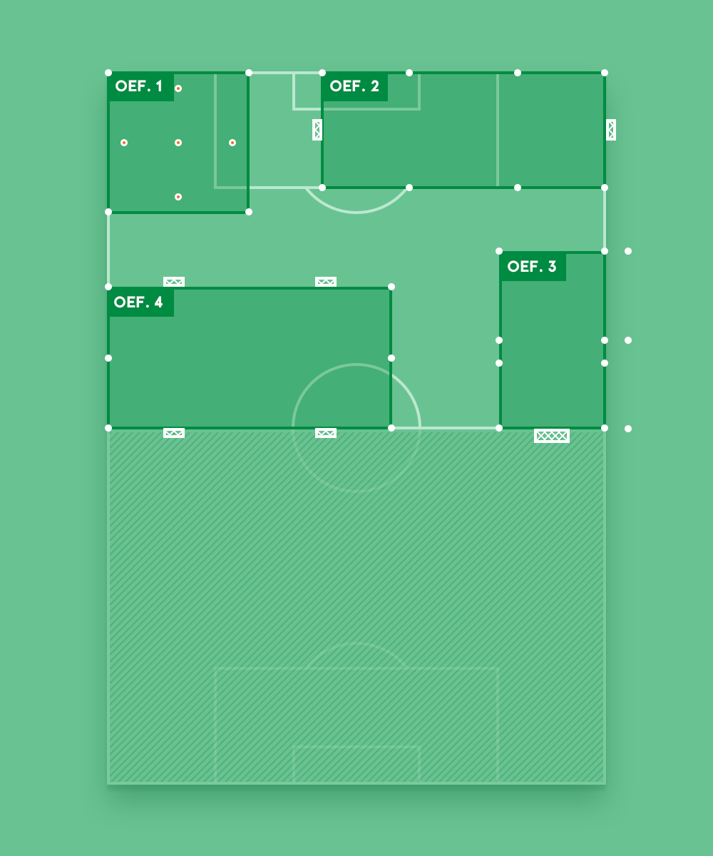 Noteer de afmetingen van de veldjes en maak groepen van minimaal 8 spelers. Na een centraal eindsignaal, draaien alle groepen met de klok mee naar de volgende oefening.