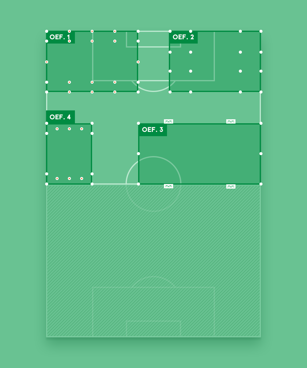Noteer de afmetingen van de veldjes en maak groepen van minimaal 8 spelers. Na een centraal eindsignaal, draaien alle groepen met de klok mee naar de volgende oefening.