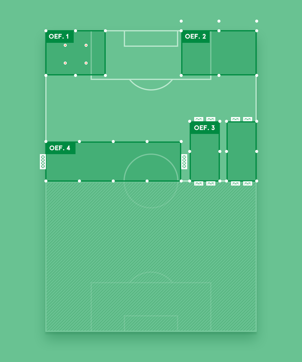 Noteer de afmetingen van de veldjes en maak groepen van minimaal 8 spelers. Na een centraal eindsignaal, draaien alle groepen met de klok mee naar de volgende oefening.