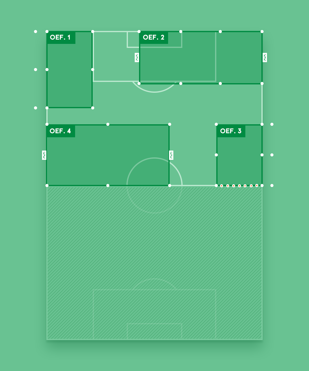 Noteer de afmetingen van de veldjes en maak groepen van minimaal 8 spelers. Na een centraal eindsignaal, draaien alle groepen met de klok mee naar de volgende oefening.