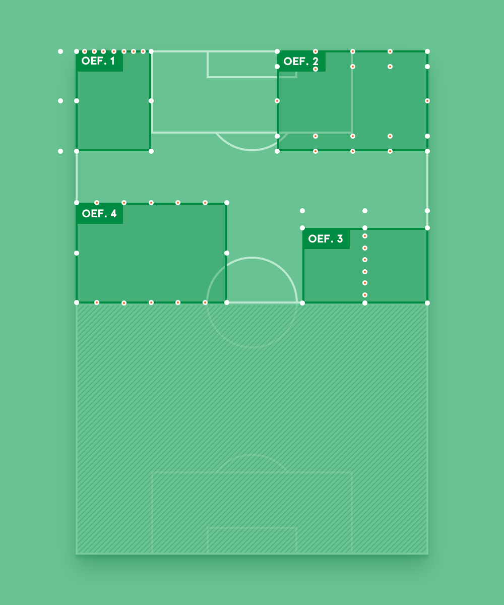 Noteer de afmetingen van de veldjes en maak groepen van minimaal 8 spelers. Na een centraal eindsignaal, draaien alle groepen met de klok mee naar de volgende oefening.